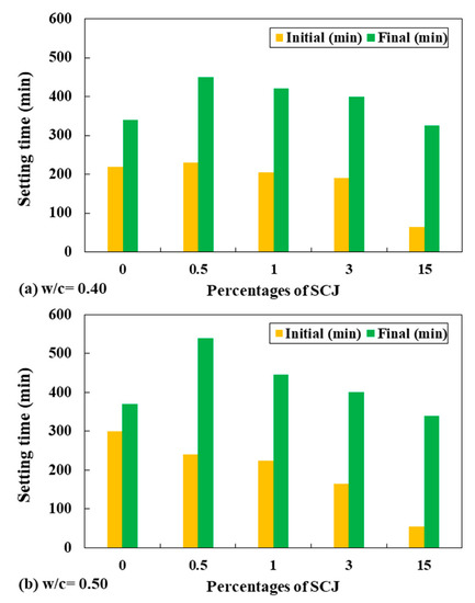Figure 5 compares the initial and final setting times of cement mortar at different w/c ratios but only for a c/s ratio of 1:1.5. In this regard, the SCJ content ranges from 0.50% to 15%. From the results, it can be seen that, at lower dosages, SCJ in mortar acts as a retarding agent. However, at higher dosages, SCJ acts as an accelerating agent in cementitious materials. Some researchers have also reported this phenomenon in their studies [7,16].
