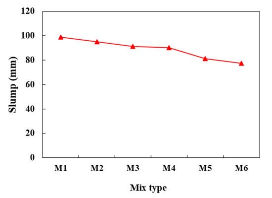 The workability (i.e., slump) of concrete with different SCJ content was measured and reported in Figure 6. Note that it was aimed to have the same workability for different mixes to avoid the impact on the mechanical strength of concrete mixes; therefore, plasticizer was added in varying percentages of concrete volume, as shown in Figure 6. Indeed, it was challenging to have the same slump value in the different mixes. The slump value ranges from 77 to 99 mm, which is considered medium-range workability of concrete [33]. During concrete mixing, it was observed that the mix became sticky with an increase in the percentage of SCJ, which was more pronounced at higher content of SCJ. The highest slump achieved was due to the addition of a superplasticizer, which enhances the movability of the fresh concrete.