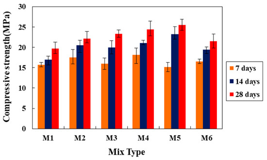 The compressive strength development of concrete samples with different SCJ content at different curing ages is shown in Figure 7. The experimental results reveal that almost no significant changes in the compressive strength are observed for the test at an early age curing (i.e., at 7 days) among the mixes with and without SCJ. For example, compared to the control mix, the variation in the compressive strength is a minimum of −3% to a maximum of 16%. In contrast, compared with the control mix, the compressive strength increases at all SCJ content for other ages (14 and 28 days). At 14 days, the increment in the compressive strength ranges from 17% to 37%, and at 28 days, this is 12% to 29%.