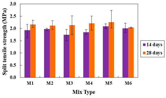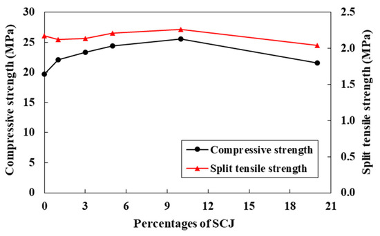 The splitting tensile strength of concrete samples was also investigated for different mixes, and their results are shown in Figure 8. Only 14 days and 28 days curing ages were considered in this case. As shown in the figure, no significant differences in the splitting tensile strength are observed in SCJ mixed concrete compared to the control. At 14 days, a minimum of −9% to a maximum of 8% change in the tensile strength is noticed due to the addition of different content of SCJ. While at 28 days, this difference is only a minimum of −2% to a maximum of 4%. The variations in the results are more pronounced when the SCJ content increases in the mixes. The mechanism behind the enhanced tensile strength should be the same as discussed for the compressive strength test. The large variation in the split tensile test in Figure 8 compared to the compressive strength reported in Figure 7 can be attributed to the applied stress in the samples during testing. Generally, in a split test, the load is applied to a small area of the sample, which may be affected by the presence of uneven pores distribution. Thus, the results may significantly vary from sample to sample. Conversely, a compressive load is applied to a larger sample area, resulting in less variation. A relationship between compressive and splitting tensile strength of SCJ mixed concrete at 28 days is also analyzed and presented in Figure 9. The improvement of the concrete strength is noticeable with the increasing content of SCJ in the mixes.