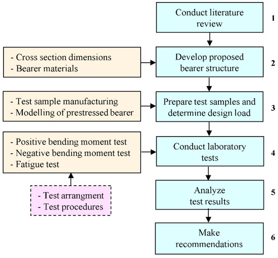 A literature review shows that research studies on the performance of prestressed bearer structures for railway turnouts (1000 mm gauge) are lacking. Therefore, this paper proposes a new prestressed bearer structure for railway turnouts for implementation in Vietnam. The proposed bearer overcomes the disadvantages of the traditional wooden sleeper structures currently used in the country. The study methodology is shown in Figure 1. The study involves six tasks: (1) conduct a literature review, (2) develop the proposed bearer structure, (3) prepare test samples and determine design load, (4) conduct laboratory tests, (5) analyse test results, and (6) make recommendations about the carrying capacity of prestressed bearers for railway turnouts using the arrangement of prestressed strands and laboratory testing.