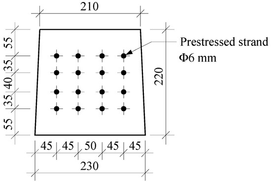 The cross-section of the prestressed bearer for turnouts is a rectangular section with 16 strands that are set apart, as shown in Figure 2. The cross-section is uniform throughout the bearer.