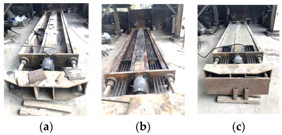Manufacturing of the PSB samples in the factory. (a) Preparing the molds; (b) Pre-tensioning of the strands; (c) Concreting into the molds.