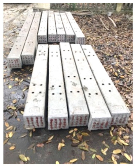 - After the completion of concrete casting, the molds with concrete were cured naturally for about 16–20 h. When the concrete reached the strength of 30.1 N/mm2, the tension force was removed, and the strands were cut. Then, the molds were carefully removed using machinery. The molds can be reused for manufacturing purposes. After being checked to ensure quality, the production samples were transferred to the yard with a 3-ton forklift.