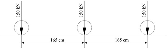 The design train load, also known as the dynamic support point force, is the force acting on the bearer that produces the design moment. In bending moment tests, the concrete bearer must withstand the design moment without forming cracks. The design train load configuration is shown in Figure 6. The dynamic rail seat load was calculated based on [18] as