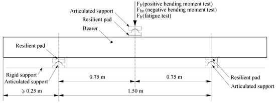 The arrangement for the static load tests of the positive and negative bending moments and the fatigue test is shown in Figure 8. For the positive bending moment, the test load was Fb, and the tests were conducted on two bearers (called PSB1 and PSB2). For the negative bending moment, the test load was Fbn, and the tests were conducted on two bearers (PSB3 and PSB4). For the fatigue test, the test load was Fb, and the test was conducted on one bearer (PSB5).