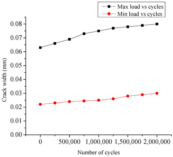 The crack widths of bearer PSB5 at maximum and minimum loads are shown in Figure 16. Due to the high prestress and short testing span, the cracks were tiny. At the first cycle, the crack width at maximum load was 0.063 mm; it increased slowly up to 2 million cycles, and at 2 million cycles, the crack width reached 0.08 mm. For the minimum load, at the first cycle, the crack width was 0.022 mm; it increased slowly up to 2 million cycles, and at 2 million cycles, the crack width reached 0.03 mm. With the minimum load level, cracks developed slowly, while with the maximum load, cracks developed faster. However, the crack growth rate was linearly stable at both load levels.