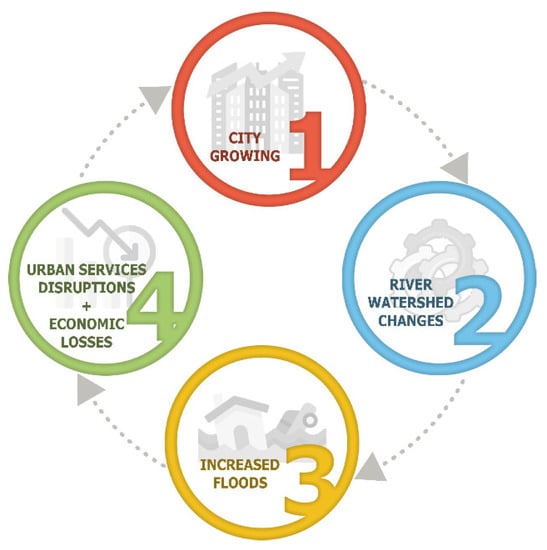 Many times, the rivers are canalized, buried and hidden, disappearing as elements of the urban landscape [], impoverishing urban biodiversity, aggravating public health problems, devaluating the built environment, and decreasing leisure opportunities, among other problems []. Moreover, disordered urban growth or unplanned urban sprawl can lead to damages to buildings and urban facilities, degrading and impoverishing areas exposed to floods, due to successive replacement costs and the interruption of services and business [,]. Flooding events can disrupt city mobility [] and affect (and be affected by) the improper collection and disposal of sewage and municipal solid waste [], becoming potential vehicles for spreading water-borne diseases []. This sequence of events can reach the critical infrastructure of a city and trigger a set of cause-and-effect connections, cascading negative effects to other systems [] in a much wider range than that defined only by the directly flooded areas. Additionally, the lack of open spaces, usually observed in dense urban environments, is responsible for limiting the possibilities of reversing this situation, since available open areas could be responsible for offering temporary storage volumes to the drainage system. Figure 1 schematically shows the cycle of city degradation caused by the failures in the urban drainage system—in brief, when a city grows quickly, without proper planning and provision of the necessary infrastructure, the land use and river system change, aggravating flood events that strike back at the city itself, generating damages that demand new urban interventions to reduce flood losses. As the city grows, this vicious cycle is fed back.