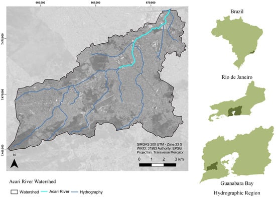 The Acari River watershed, shown in Figure 2, is one of the largest and most populous in the Rio de Janeiro municipality, where there are numerous urban drainage problems, varying from gaps in the infrastructure provision to system maintenance, and consequent degradation of the natural and built environment. It is also an area recognized for its social claims. In this watershed, the urbanization did not respect the “water spaces”, occupying riparian areas and even riverbanks, in the most critical points. A previous study developed for this area [] showed that a large portion of the population living there is not able to recover from flooding losses over time, being heavily affected even when considering flooding events of low return periods (such as 5 years, for example).