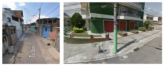 Difference between the constructive standards of a “favela” (left image—located in Area 3) and regular occupations (right image—located in Area 1). Source: Street View (Google).