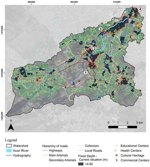 Specifically, four areas in the Acari River watershed can be highlighted in terms of flooding, as shown in Figure 3. Additionally, the figure shows the flood depths separated into 8 flooding ranges.
