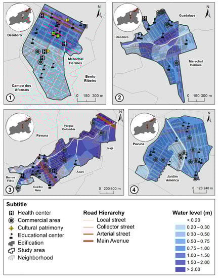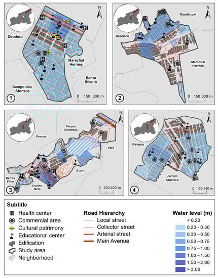 The constructive standards in the Acari River watershed change spatially, depending on the type of urbanization. “Favelas” (or slums) and informal occupation show houses very close to the street level, while other regions present dwellings at higher levels, more protected from possible floods, as shown in Figure 4.