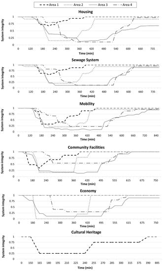 Computing the System Integrity Index for each time step allows us to draw a curve, point by point, which represents the system behavior over time. After the construction of the associated graphs, dimensionless resilience values can be obtained by the integration of the area under the graph divided by the maximum possible area of the graph, representing the regular full operational system (in which the System Integrity Index has a constant value equal to 1). The final values vary from 0 to 100%. The closer to 100%, the greater the system resilience is.