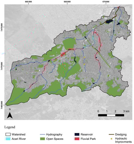 In this context, the riverine areas with potential to be incorporated into the drainage system infrastructure were identified to compose the imagined fluvial park and receive part of the flood volumes. The mapping of the open spaces to compose the macro and micro drainage system was carried out, selecting parks and squares, mainly the ones that are already floodable (but without any control). It was also suggested to preserve the existing green and permeable areas, incorporating them into the proposed open spaces system. In the absence of potential open spaces for flood mitigation, marginal areas of the watercourse should be expropriated, relocating the population settled in irregular urban occupations, mainly if these areas are floodable and represent risk to this population. Additionally, the proposition of blue-green infrastructure considers an environmental improvement along the Acari river, including the possibility to increase the quality of life and add recreational spaces for the population.
