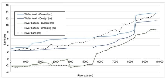 Modifications were performed in the mathematical model—MODCEL—to reflect the proposed Design Scenario, and the obtained results can be observed in Figure 9 and Figure 10. The water profile along the main course of the Acari River (Figure 9) shows that overflows no longer occur in the main river for the design storm with a 25-year return period. Additionally, the flood map obtained for the Design Scenario (Figure 10) shows a significant reduction in floods when compared with the current situation. The remaining flood depths on the map are related to the non-simulation of the smaller pipes in the minor drainage system (and to real problems related to the minor drainage system performance). This consideration is consistent with the local reality since, for the return period of 25 years, it is expected that these pipes will fail (it is worth noting that this system is dimensioned for a return period of 10 years in Brazil).