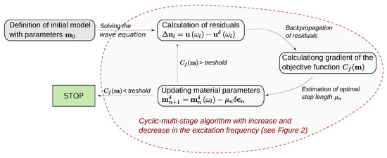 The full-waveform inversion procedure is implemented in the DENISE (subwavelength DEtail resolving Nonlinear Iterative SEismic inversion) 2D time domain C-based code [49] and shown by the flow chart in Figure 1.