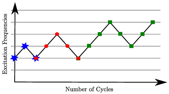 Inherent to all inverse problems in engineering are the “ill-posedness” and the non-linearity of the problem, which need to be attenuated. In the case of FWI, the first step is to formulate a good starting model, where the model properties are close to a global minimum. Therefore, the parts of the long wavelengths from the “true” model should be represented by the starting model as satisfactorily as possible. Additionally, pre-conditioning or regularization should be applied. A reliable tool was found when carrying out the inversion at different stages, i.e., for different excitation frequencies, to cope with the non-linearity and ill-posedness of the problem. Each stage is carried out with a certain frequency, and according to [50], the low frequencies are more linearly related to the model perturbations compared to high frequencies. Thus, the inversion stages start with lower frequencies and increase to higher-frequency components of the data. The inversion output of each stage is used as the input for the next stage; thus, regions of high and low particle velocities are being captured. As mentioned, higher stages have the advantage of providing a better resolution; however, stability of the inversion deteriorates even with careful and early stopping. We observe divergence at many positions in the domain, which finally would lead to incorrect interpretations. To mitigate this and to further regularize, the process is repeated by going back to lower frequencies and then increasing again. This results in a cyclic multi-stage algorithm, which embraces the updating of the model parameters by setting borders in the frequency range; described here as cycles. A graphical sketch of the idea of this algorithm is given in Figure 2. As shown, on each intersection with a horizontal line, a FWI is run with a different excitation frequency. Frequencies increase and then decrease in one cycle. Repeating this provides chances to obtain high-resolution identification and keeps the effects of noise and resulting artifacts in the images low. Thus, the initially strongly ill-posed problem could be regularized sufficiently so that it might be applied in practice. In particular, for the first cycle(s), it is recommended not to probe with the highest excitation frequencies. The last cycle should be followed by an increase towards the maximal frequency.