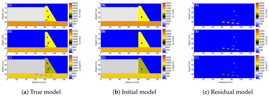 FWI model for acquisition setups with (A) distribution (B) distribution (note that shear waves only travel through solids) and (C) distribution.