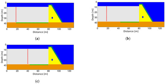 Setup 1 consists of 28 excitation sources 65 m away from the dam surface and a total of 165 sensors/receivers on the dam and the reservoir bed/foundation. Receivers are placed at an interval of m on the dam and 1 m on the foundation. Setup 2 is similar to setup 1, in the way that the same number of excitation sources is employed; however, in total, 135 sensors are used. The receivers on the dam foundation are placed within 35 m of the dam’s face. Lastly, the same numbers of sources and receivers in setup 2 are applied to setup 3; the difference here is the distance of the excitation sources from the dam’s face. The excitation sources are closer to the dam’s face (i.e., 35 m away) than in the other setups.
