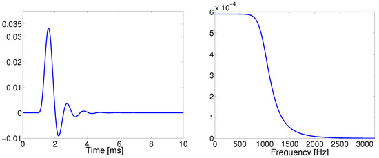Since the FWI, based on local optimization, is sensitive to the initial model, an initial model containing the long-wave part of the model to be resolved is required to enable convergence to the global minimum. In contrast with geophysical exploration, which requires a series of field experiments to obtain information for the initial model, a priori information on the parameters of the dam material can often be obtained, since most of these structures are man-made. Therefore, the material properties can be used as the upper limit during construction, as in this case. A closer look at Figure 3 shows that the true model in Figure 3a and the initial model in Figure 3b differ only in the inclusion of regions with deteriorated material properties in the true model (see Figure 3c). Therefore, the “as-built” material properties of the dam are taken as the initial model. To study the dam material, spike wavelets are emitted successively from each of the sources (e.g., airguns). A series of low-pass filtered spikes are used here, as shown in Figure 4. For each excitation, the source wavelet as shown in Figure 5 propagates for a duration of s, and the time interval () used for the analysis is s, which satisfies the Courant–Friedrichs–Lewy criterion for stability.