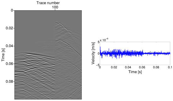 The signals recorded by the 2D receivers as a result of the wave propagating in the medium are shown in a Figure 6. This seismogram corresponds to the acquisition setup 1 (cf. Figure 4a). Similar seismograms can be recorded for setups 2 and 3, where the number of traces is reduced, because the number of sensors is decreased. These synthetically generated seismograms are used as field data for the inverse analysis (i.e., FWI).
