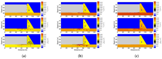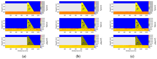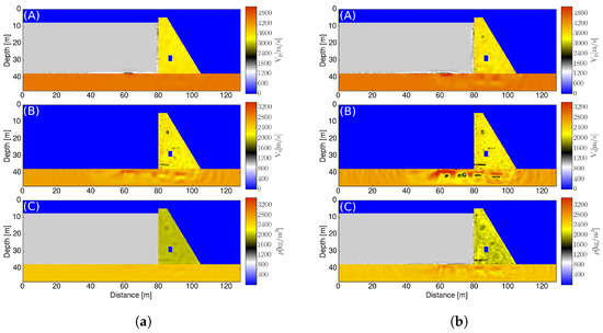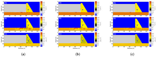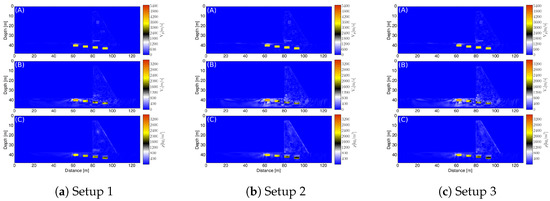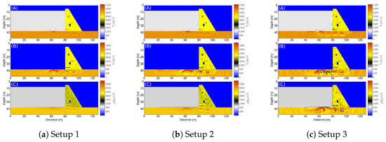 The different acquisition geometries used are shown in Figure 4. The effects of the acquisition setups on the inversion quality shall be investigated and, therefore, the inversion results for the final stage of each setup are shown in Figure 7 for each of the model parameters. Additionally, the residuals between the inversion results and the true model are given in Figure 8. Overall, the damage in the dam structure can be easily identified on visual inspection. Anomalies in the foundation of the dam were not correctly identified. The best way to identify the anomalies/damage in the dam structure and foundation is to use the parameter instead of using one of the other two material parameters or .