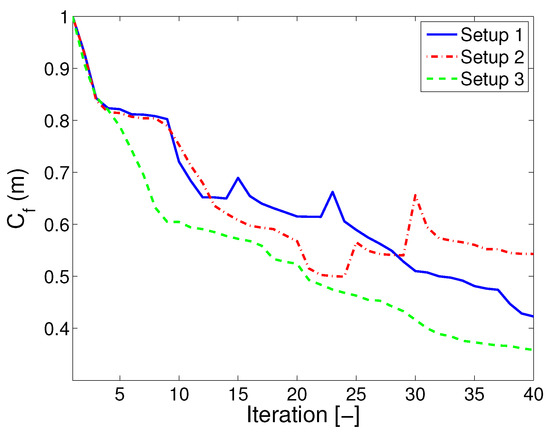 Cost function value evolution for each iteration: comparison of cost function (normalized) over 40 iterations for each acquisition setup.