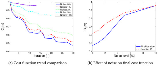 Cost function comparison for different noise levels: (a) Cost function trend showing shorter trend for higher noise levels. (b) Influence of noise on final cost function at the end of the simulation for each noise level, and also at end of the shortest simulation (13 iterations).