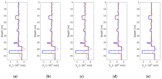 Profile cut for through the dam in regions of reconstructed anomalies for different noise levels showing a comparison between the true model (—), FWI model (- -) and the initial model (⋯). (a) 0% noise (b) 1% noise (c) 2% noise (d) 5% noise (e) 10% noise.