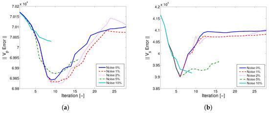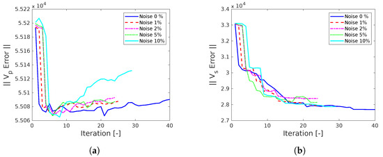 where denotes the model parameter, represents the true model, is the iteration number, is the noise level being considered and denote quantities effected by noise. Therefore, an attempt is made to efficiently calculate the optimal number of iterations that is required to identify the anomalies in the structure, especially for noisy measurement data. This is realized by stopping it for the first time where and is a measure of the noise level in the (synthetically) collected data. Therefore, the reconstruction errors of the model parameters and are plotted over the number of iterations in Figure 14. Here, it can be observed that the model has its minimum at iteration number , except for the noise level of 10% that stops earlier. In contrast, the minimal reconstruction error of the model lies at . Although the model provided better inversion results than , a comparison between the FWI results after and 28 iterations, which is the final one, is shown in Figure 15. The comparison also intends to check whether the models with the least reconstruction error provide the best results.