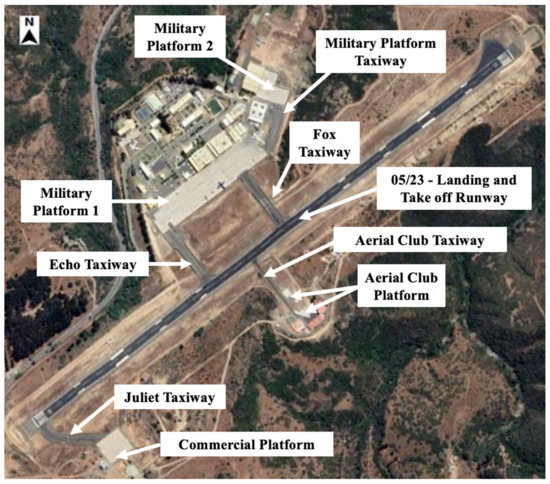 The case study selected the Airport of Viña del Mar is located at 32°56′59″ South latitude and 71°28′43″ West longitude, 15 km northeast of the city of Viña del Mar in the Valparaíso Region at an elevation of 140 m. The airport currently has a runway that is 1750 m long by 30 m wide, oriented from southwest to northeast, with thresholds designated 05/23 according to magnetic north. Figure 1 shows a floor plan with the location of the taxiways and the airfield platform.