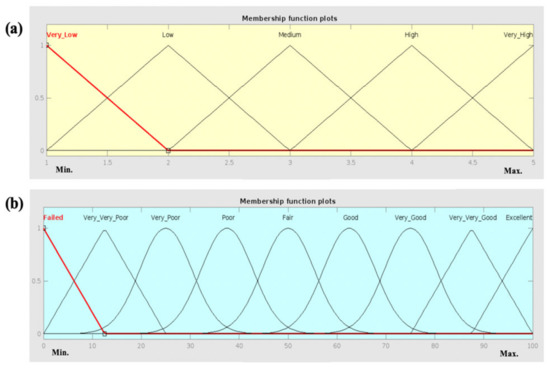 The fuzzy logic method focused on the service life prediction of concrete pavement is based on previous experience regarding the functional service life of infrastructures in Europe (Spain, Portugal) [28,29] and South America (Colombia and Chile) [30,31]. Table 2 describes the quantitative-qualitative input variable valuations. The input parameters of the FIS are fuzzified using Gaussian and Triangular membership functions. These particular MFs were selected to generate the FIS, which is able to predict the functional service life of concrete pavement considering the local context of Central Chile. The input and output variables are associated with different linguistic labels. Figure 4 shows the mfs of the input-output variables. Concerning the type of membership function of each input-output parameter, Jamshidi et al. (2013) state that it depends on the particular problem to be modeled, the experts’ knowledge available, and even the particular and specific local contexts of the phenomenon to be predicted [32].