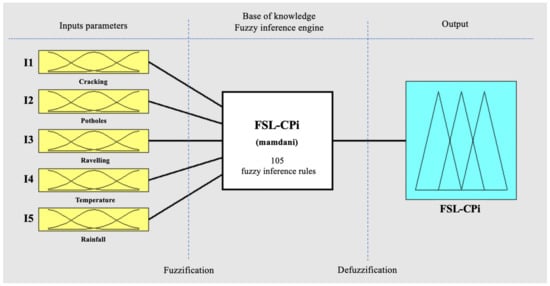 The fuzzy logic system’s FSL-Concrete Pavement index (FSL-CPi) is able to achieve an output focused on the functional service life of concrete pavements concerning a set of three parameters regarding intrinsic vulnerability (I1—cracking, I2—potholes, and I3—raveling) and two external hazards related to atmospheric affections (I4—temperature and I5—rainfall) [27].
