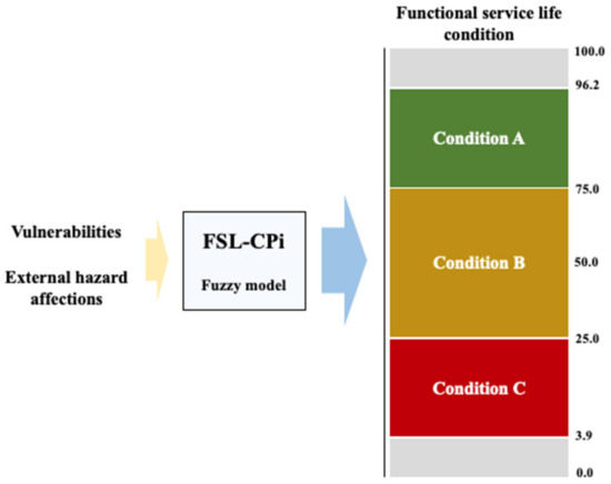Some of the main advantages of the CoA technique is that all active membership functions contribute to the defuzzification process of the FIS [41]. The principal model’s output is the FSL-CPi, allowing stakeholders to make decisions concerning a set of horizontal infrastructures (concrete pavements) located in a specific local context. This fuzzy model has been developed considering three functional service life levels according to the ISO31000:2018 [42]: Condition A—The infrastructure presents an adequate functional level. In this situation, the model does not recommend corrective or preventive intervention—only a monitoring survey is recommended; Condition B—Benefits and costs and preventive measures must be taken into account and balanced. A preventive intervention should be considered in a short period of time; and Condition C—The risk is contemplated as an intolerable measure, regarding a very high priority of intervention in a short period of time. A corrective intervention must be considered as soon as possible to preserve the infrastructure.