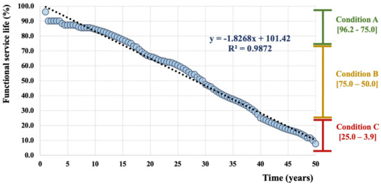 The set of 100 theoretical samples has been developed using Microsoft Excel. The first case study corresponds to the lowest possible value (1.0 point) of the five inputs. The last application shows the highest possible value (5.0 points) of the five input parameters of the fuzzy model. The remaining 98 cases assessed are a set of arbitrary combinations that assign values from 1.0 to 5.0 for each of the sets of input variables. In this case, a correlation of Pearson’s coefficient (r) of 0.9935 was obtained for the 100 theoretical cases developed and applied in this study. The analysis of the determination coefficient (R2) that estimates the proportion of variance of the x-axis (time estimation in years) related to the y values (functional service life index) demonstrated R2 = 0.9872 based on a lineal curve y = −1.8268x + 101.42, which indicates a very high correlation between the variables considered in the theoretical study (functional service life and time estimation in years). Figure 8 illustrates this approach.