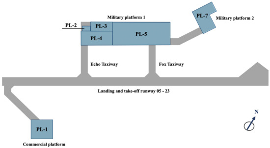 Two military platforms, Military Platform 1 and Military Platform 2 are connected by a shoot called the Military Platform Shoot. Military Platform 1 is comprised of 1083.5 m2 of flexible pavement (asphalt) and 27,662.2 m2 of a rigid pavement (concrete) and has a 4-m-wide asphalt margin on the southwest side of the platform. Military Platform 2 is comprised of 819 m2 of flexible pavement (asphalt) and 5435.9 m2 of a rigid pavement (concrete) and has 5-m wide asphalt margins. The Military Platform Filming is 137 m long by 18 m wide and has 6 m margins, adding a paved surface of 4080.6 m2 of flexible pavement (asphalt). The Air Club Platform measures 2298 m2 of flexible pavement (asphalt) and 864.5 m2 of a rigid pavement (concrete) [14]. Figure 2 shows a floor plan with the different taxiways and platforms of the Viña del Mar Airport. Table 1 provides a summary of the geometry and materiality of the pavement located in the airport movement area.