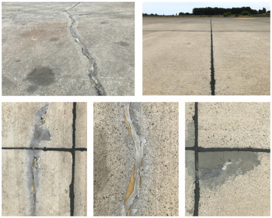 This subsection considers the practical application of the fuzzy model FSL-CPi to six particular sections of concrete pavements in the airport of Viña del Mar (Concón, Valparaíso region, Chile). Figure 9 shows the particular location of each case study (concrete pavements) in Viña del Mar Airport. It should be mentioned that a total of two parameters are constant in this application: I4-temperature corresponds to 1.9, and I5-rainfall relates to 1.9. This is mainly because the airport was under examination and situated in the same city, considering the similar local background. The remaining three variables (I1-cracking, I2-potholes, I3-ravelling) were evaluated considering an in-situ visual inspection (Figure 10).