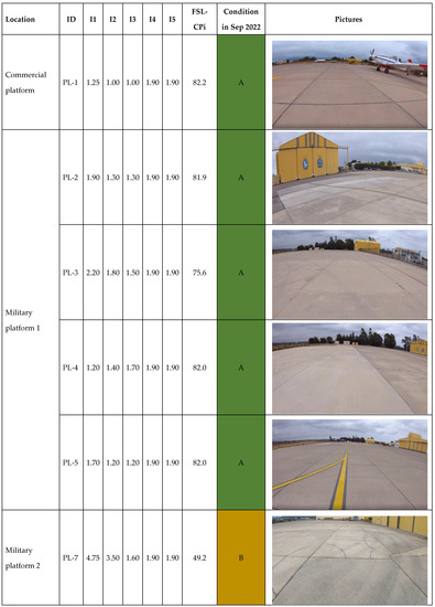 The following results were achieved after the application of the fuzzy model FSL-Cpi—output: functional service life of concrete pavements: (i) PL-1 was categorized in Condition A (upper level of concrete pavements functionality) with a total of 82.2% of 92.6; (ii) PL-2 obtained 81.9% of the FSL-CP index, which has been ranked as Condition A; (iii) PL-3 is also classified as Condition A and obtained output of 75.6%, and the worst variable evaluated was I1-cracking with 2.0 points of 5.0 points; (iv) PL-4 and PL-5 obtained an FSL-CPi of 82.0% (Condition A) in both cases; and (v) PL-7 achieved the worst classification with a functional service life index of 49.2%—Condition B (medium level of concrete pavements functionality). Variable I1- cracking was ranked at 4.75 points of 5.0 points, and I2—potholes were rated as a total of 3.5 of 5.0 points. Figure 11 shows the current functional performance of the six case studies analyzed in the Airport e of Viña del Mar, Central Chile.