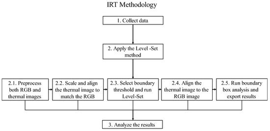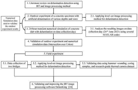 The level-set method was chosen for post-image processing due to its high accuracy and reliability of delamination detection [24]. As shown in Figure 2, the process follows the general framework of first preprocessing the thermal image to filter noise, adjusting the size, and edge-preserving smoothing. Then, the normalized gradient map and the initial contour generation module are generated using the edge indicator generation module to have the initial level set function. Finally, iterations are used to update the level-set function using the edge indicator function to upgrade the initial contour following the PDE-based GAC model [24]. The purpose behind preprocessing the image was to provide better and more accurate results. Thus, a difference image was used to remove outliers which were then replaced by the nearest neighbor. Then, after all the necessary steps were taken, a few evaluation metrics, such as the intersection over union (IoU), were used to determine the accuracy of delamination detection that the level-set method offered [24]. Figure 3 shows the framework applied for collecting and analyzing the data. The outdoor experiment and the in-service bridge decks followed the same methodology and data analysis steps.