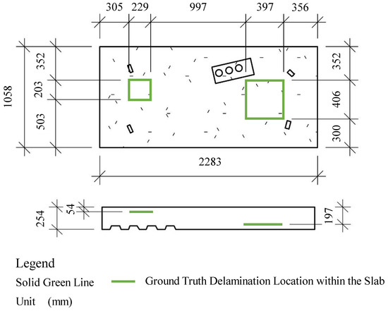The slab used for the outdoor experiment is a reinforced concrete specimen used in [15]. The slab is a bridge deck specimen with multiple artificial delamination areas that was designed as a normal-weight concrete specimen with a compressive strength of 34.5 MPa. Furthermore, its dimensions are shown in Figure 4. In addition, according to the original research, the slab has two mimicked delamination areas, including a shallow one that is 54 mm (2.13 inches) from the top surface, which is the targeted detection area and is plastic and hollow. Then, the second one is at a depth of 197 mm (7.76 inches) and is plastic and solid.