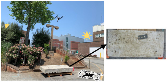 Figure 5 shows the slab while collecting the data with the sun’s orientation throughout the day (sunrise to sunset). The thermal and RGB pictures of the slab top were collected using a DJI Inspire 1 drone [61] with a FLIR Zenmuse XT camera [62] and Zenmuse X3 camera [63], respectively. The utilized equipment is compared to the equipment used in [16], which included a DJI M600 Pro drone [64], FLIR A8300 camera [65], and Zenmuse X5 camera [66]. Table 1 shows the specifications for the thermal camera; Table 3 shows the RGB cameras’ specifications, while Table 4 shows the drones’ specifications.
