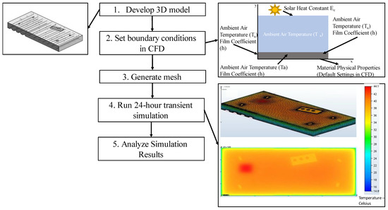 Figure 6 summarizes the steps followed for developing the numerical simulation. A virtual model of the slab and mock delamination placed within it were modeled using Autodesk Revit 2021. The model was then imported to Autodesk CFD 2021, where the materials and boundary conditions were set up to represent real-life conditions most closely, as shown in Table 5. The model requires the assignment of both emissivity and transmissivity values, which all were assumed to be the default values assigned by Autodesk CFD 2021.