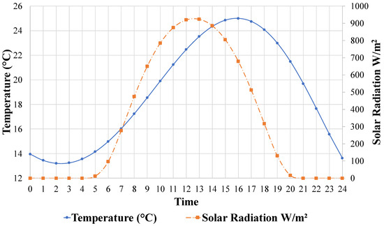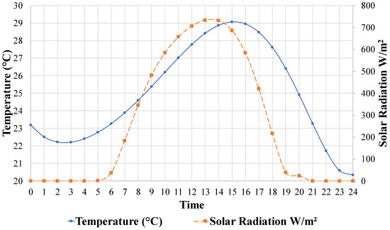 Figure 7. Temperature and solar radiance trends for the 24 June 2021, in Newark, Delaware [67].
