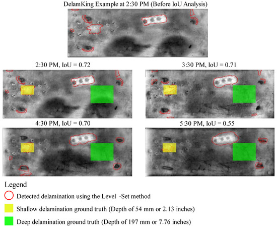 The data was collected on the 24 June 2021, a clear summer day, within the time frame of 2:30–5:30 p.m., where each picture was taken at 30 min intervals. A sunny day was picked to provide images with minimal interference from environmental factors such as clouds and rain. The data collection period was selected based on conclusions of previous research that the afternoon period provides the best detectability accuracy [19,24,36]. Furthermore, the camera was set in high gain mode, as this mode has a more effective detection accuracy of thermal contrasts within small ranges [62]. The level-set image analysis results were then compared to the known ground truth location of the delamination through IoU values.