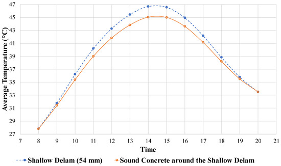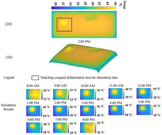 Then, the slab top temperature data were exported from the simulations to determine the period in which the delamination seemed most visible. A MATLAB script was applied to further process the results of the CFD simulation. The script consists of cropping the thermal image, identifying its color scale, and resetting the temperature range. The script produces images with a temperature gradient showing the contrast between sound areas and delamination areas.