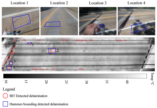 The collected data for both the outdoor experiment and bridge were analyzed using DelamKing [60], an image processing software [19,24]. The software was designed for detecting, locating, and quantifying delamination in concrete bridge decks and was developed based on the level-set method. In the case of the outdoor experiment, the size and location of the mimicked delamination are known. Thus, a comparative study between the detection results and the ground truth can be efficiently conducted. In the case of the in-service bridge deck data, both were analyzed in reference to hammer-sounding results. Additionally, coring samples were collected for the Nebraska bridge.