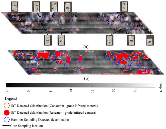 Figure 16. Nebraska bridge level-set thermal image result. (a) results of the consumer-grade camera with a boundary threshold of 0.3 (Partially adopted and modified from [31]), (b) results of the research-grade camera (Adopted and modified from [24]).