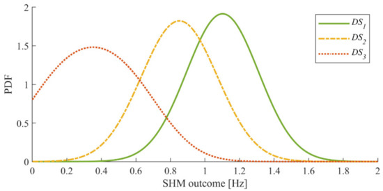 As for the distribution of the frequency values in the different states of the bridge, it is supposed that they are uniformly distributed within the corresponding frequency range. Specifically, the frequency ranges are 1.0–1.2 Hz for , 0.7–1.0 Hz for , and 0.0–0.7 Hz for . Since continuous distributions are employed, the integral version of Equation (13) is adopted. The resulting likelihood functions, shown in Figure 1, are truncated to obtain only positive frequency values.