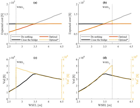 The results of the analysis are reported in Figure 2. Figure 2a,b show the results of the Prior analysis for different decision scenarios and WSEL thresholds. The grey and black solid lines display the expected costs of the actions Open and Close, respectively. The red line relates to the optimal action selected in the risk-based scenario (Scenario 1), which is the one corresponding to minimum expected costs or, equivalently, minimum risk. In this case, the critical WSEL is defined as the value of the water level for which the two actions lead to the same expected cost, i.e., roughly 3.5 m. For a WSEL lower than 3.5 m, the optimal action is Do nothing. Instead, for higher values, Close the bridge has a lower expected cost. The dotted yellow lines represent the expected cost of the optimal action in case the decision is based on the WSEL (Scenario 2). Specifically, Figure 2a shows results relating to WSEL1 (Scenario 2a) and Figure 2b to WSEL2 (Scenario 2b).