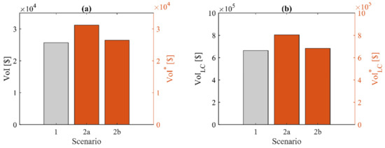 Figure 3 shows the VoI integrated over the PDF of , according to Equation (14), and the corresponding life-cycle VoI, computed according to Equation (8). In Figure 3a, the lowest VoI is associated with Scenario 1 in which risk-based decision-making is carried out during both the Prior and the Pre-Posterior analysis. In Scenario 1, the VoI as a function of the WSEL presents a value equal to or lower than the VoI obtained in Scenarios 2a and 2b. Consequently, the associated expected VoI is the lowest. The highest VoI relates to Scenario 2a, where the bridge is closed for a relatively low value of the WSEL during the Prior analysis. The intermediate VoI characterizes Scenario 2b. This can be explained by considering that even if the maximum VoI is obtained for Scenario 2b, this value is obtained for a WSEL value with a relatively low probability of occurrence (the flood magnitude is assumed to have a truncated exponential distribution, with a maximum probability density of ). Similar considerations can be drawn for the life-cycle VoI shown in Figure 3b.